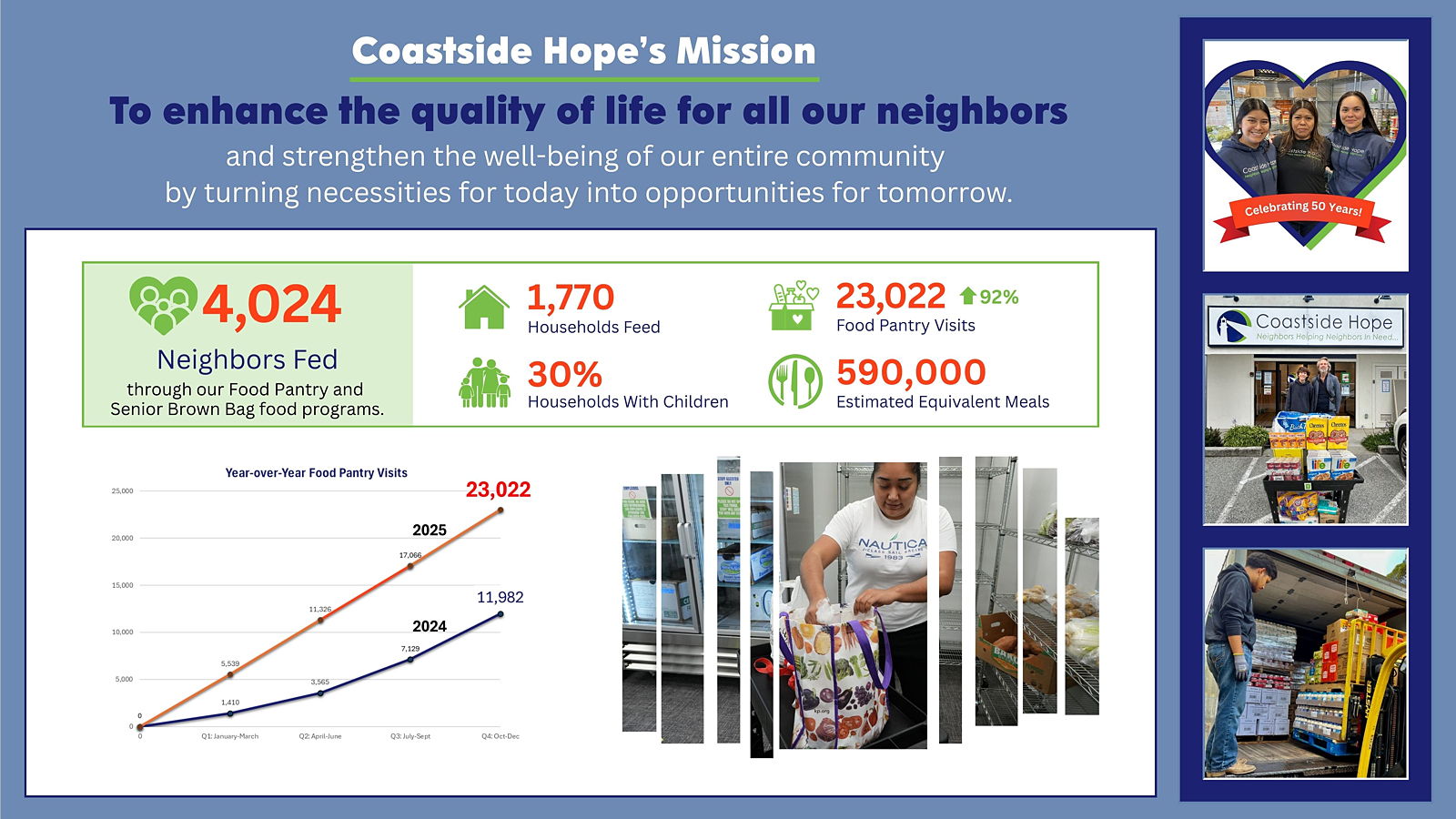 The Coast is experiencing a crisis of food insecurity fueled by the increased financial difficulties faced by our neighbors. The lack of affordable housing; rising cost of living compounded by inflation rates, tariffs, and health care costs; and the loss of many government benefits has intensified the need for Coastside Hope's food services.